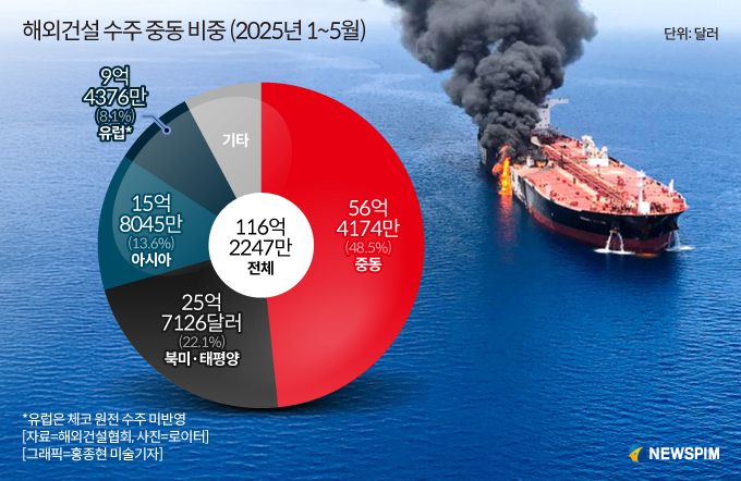 중동은 한국 해외 건설 수주에서 역사적으로 절반 이상을 차지하는 핵심 시장이다. 해외건설협회에 따르면 올해 1월부터 지난달까지 한국 기업의 해외건설 수주액은 총 116억2247만달러(약 16조437억원)로, 이 가운데 중동이 56억4174만달러(약 7조7890억원)로 전체의 48.5%를 차지했다.