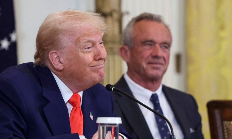 지난달 22일 미국 워싱턴 디시(D.C.) 백악관 이스트룸에서 열린 ‘미국을 다시 건강하게’ 위원회 행사에 참석한 도널드 트럼프 미국 대통령과 로버트 F. 케네디 주니어 보건복지부 장관. 워싱턴/로이터 연합뉴스