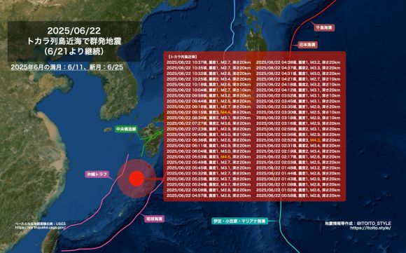 도카라 해역에서는 21일 오전부터 지진이 잇따랐으며, 24일 0시 기준 총 295회 중 진도 4는 4회, 진도 3은 18회에 달한다.