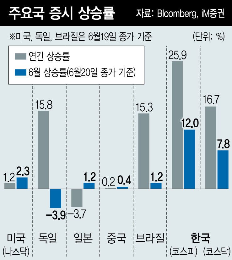 주식시장에서 새 정부 ‘허니문 랠리’ 기대감이 강하게 확산하고 있다. 6월20일 종가 기준 코스피는 전달 대비 12% 급등하면서 3년5개월 만에 3000선을 넘어섰다. 더욱이 올해 연간 코스피 상승률도 25.9%로 주요국 중 가장 높은 상승 폭을 기록 중이다. 지난 몇 년간 주요국의 증시 급등만을 바라보던 국내 증시를 생각하면 격세지감이라는 표현이 맞을 정도다.