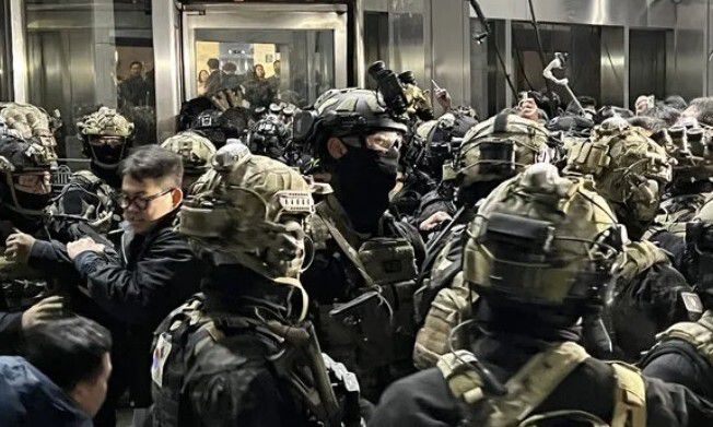 윤석열 대통령이 비상계엄을 선포한 뒤 2024년 12월4일 새벽 서울 국회의사당에 무장한 군인들이 진입을 시도하고 있다. 연합뉴스 |