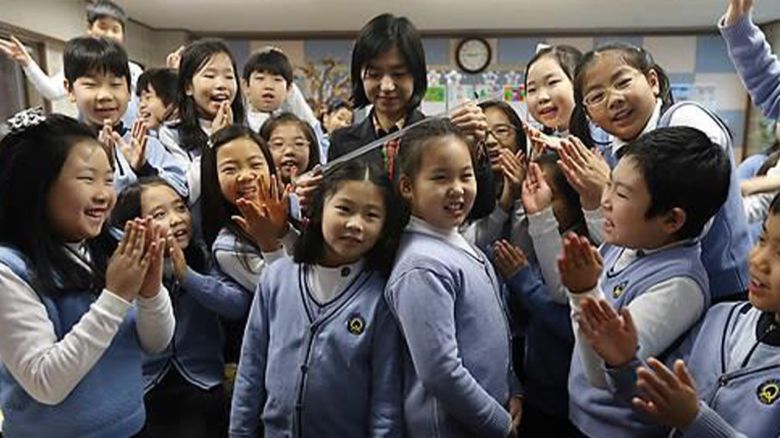 ▲ 초등학교에서 선생님이 학생들의 키를 자로 재고 있다.