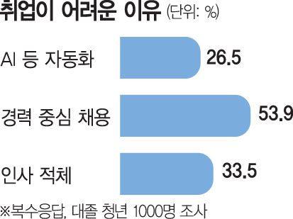 구직자들은 경력 중심 채용을 큰 장벽으로 인식했다. 대한상의가 대졸 청년 1000명을 대상으로 취업이 어려운 이유를 조사한 결과 53.9%(복수 응답)가 ‘경력 중심의 채용’을 꼽았다. 이어 ‘인사 적체에 따른 신규 채용 감소(33.5%)’ ‘인공지능(AI) 등 자동화로 인한 고용 축소(26.5%)’ 순이었다.