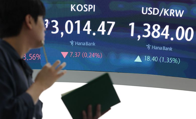 코스피가 전 거래일(3021.84)보다 7.37포인트(0.24%) 내린 3014.47에 마감한 23일 오후 서울 중구 하나은행 딜링룸 전광판에 지수가 표시되고 있다. 코스닥 지수는 전 거래일(791.53)보다 6.74포인트(0.85%) 하락한 784.79에 거래를 마쳤다. 서울 외환시장에서 원·달러 환율은 전 거래일(1365.6원)보다 18.7원 오른 1384.3원에 주간 거래를 마감했다. 뉴시스 |