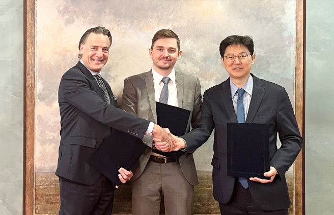 (오른쪽부터)최영 현대건설 뉴에너지사업부장과 로랑 레뷰글 포툼 신규원전담당 부사장, 엘리아스 게데온 웨스팅하우스 수석부사장이 19일(현지시각) 핀란드 신규 원전 건설 사업을 위한 사전업무착수계약(EWA)을 체결하고 기념 촬영을 하고 있다.