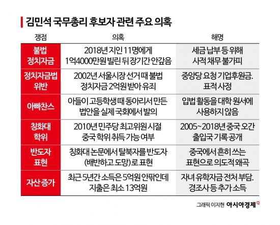 불법 정치자금 금전거래 의혹도 있다. 김 후보자는 2018년 4월 강모씨 등 11명으로부터 1억4000만원을 빌린 뒤 임명동의자료 제출 시점까지 갚지 않았다. 김 후보자는 SNS를 통해 추징금 및 세금 압박을 해결하는 과정에서 벌어진 일이라고 해명했다. 다만 강모씨는 2008년 김 후보자의 정치자금법 위반 사건을 비롯해 이후 정치 여정을 함께하며 후원자 관계를 유지해왔는데 이 관계가 말끔하게 설명되지 않고 있다.