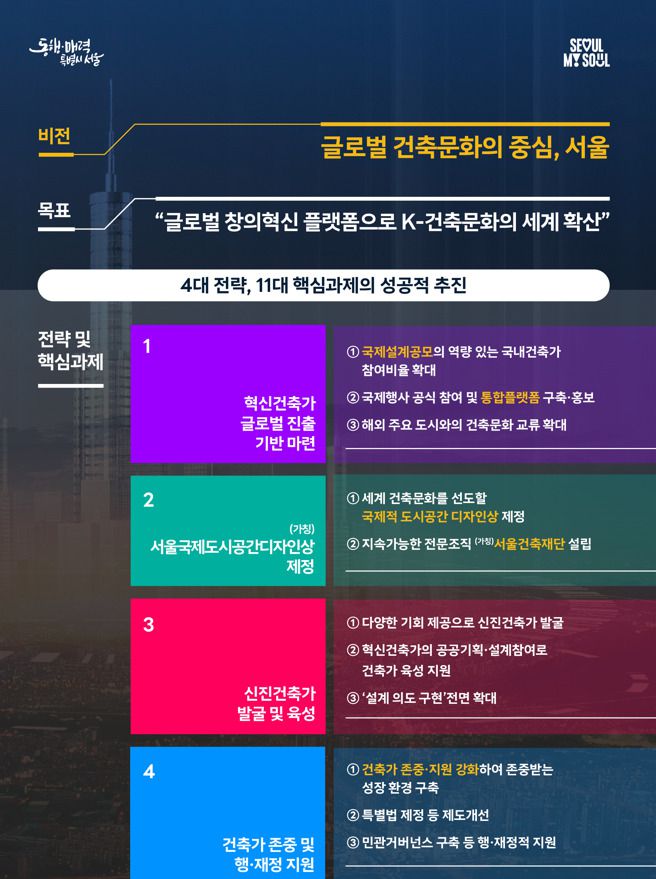 서울시는 건축가들의 △국내 프로젝트 참여 기회 확대와 해외 진출 지원 △국제도시공간디자인상 신설 △혁신건축가 발굴 및 지원 △건축가 존중문화 정착을 주요 내용으로 하는 'K-건축문화 종합지원계획'을 24일 발표했다. 4대 분야 11개 과제를 2030년까지 중점 추진한다.