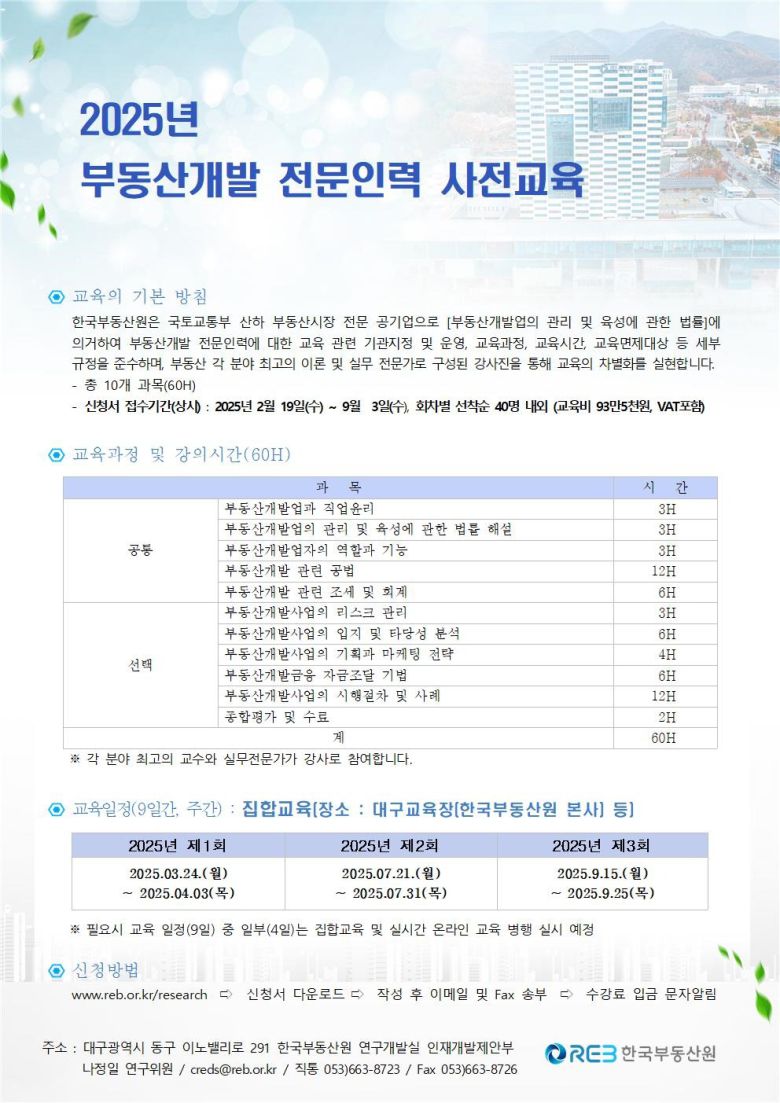 사전 교육은 7월 21일부터 31일까지 9일간 한국부동산원 본사에서 집합교육으로 진행된다. 교육을 이수하면 '부동산개발 전문인력 사전교육' 수료증이 발급되며, 교육 대상자는 관련 규정에 따른 자격을 갖춘 이들이다. 신청은 7월 7일까지 이메일로 상시 접수할 수 있다.