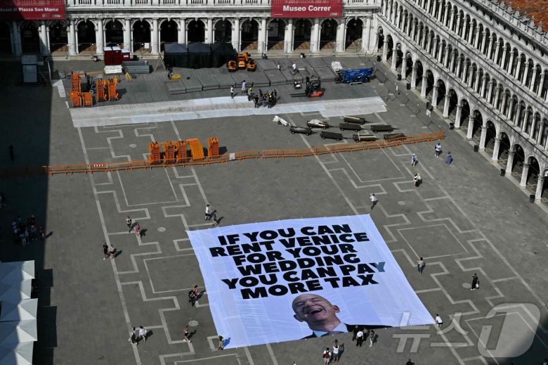 23일(현지시간) 국제 환경단체 그린피스 활동가들이 이탈리아 베네치아의 산 마르코 광장에서 제프 베이조스의 사진과 함께 "당신이 결혼식 장소로 베네치아를 빌릴 수 있다면 더 많은 세금을 내야 한다"는 문구가 적힌 대형 현수막을 설치하고 있다. 베네치아에서는는 이달 말 아마존 창업자 겸 CEO 제프 베조스와 언론인 로렌 산체스의 결혼식을 열릴 예정이며, 200명 이상의 하객이 참석할 것으로 예상된다. 25.06.23 ⓒ AFP=뉴스1 ⓒ News1 김예슬 기자