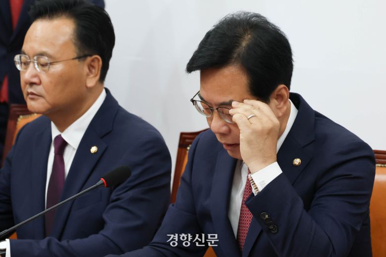 송언석 국민의힘 원내대표가 24일 국회에서 열린 원내대책회의에서 발언하고 있다. 성동훈 기자 |