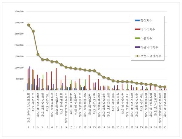 연금 브랜드평판 1위를 기록한 미래에셋자산운용 연금 브랜드는 참여지수 311,622 미디어지수 976,703 소통지수 554,098 커뮤니티지수 1,065,328이 되면서 브랜드평판지수 2,907,750으로 분석됐다. 지난 5월 브랜드평판지수 3,178,589와 비교해보면 8.52% 하락했다.