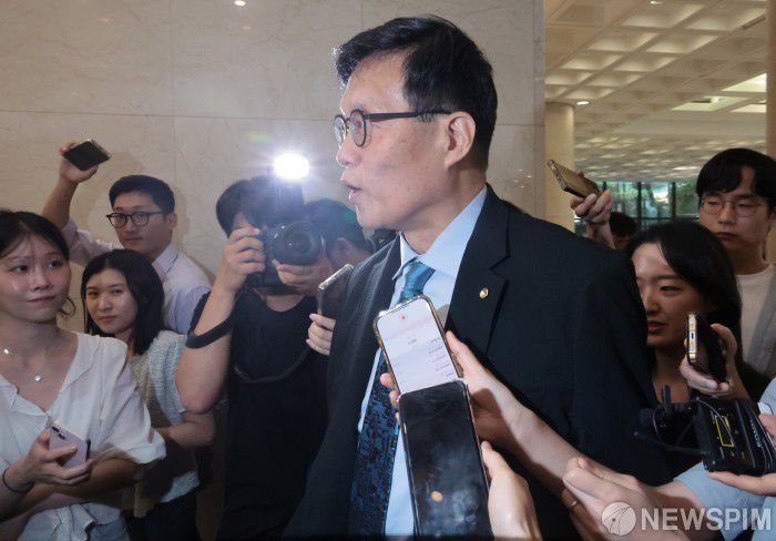 [서울=뉴스핌] 이길동 기자 = 이창용 한국은행 총재가 23일 오후 서울 중구 은행회관에서 은행장들과 가계대출과 가상자산 등 금융 현안을 논의하기 위해 간담회장으로 향하며 취재진의 질문에 답하고 있다. 2025.06.23 gdlee@newspim.com |