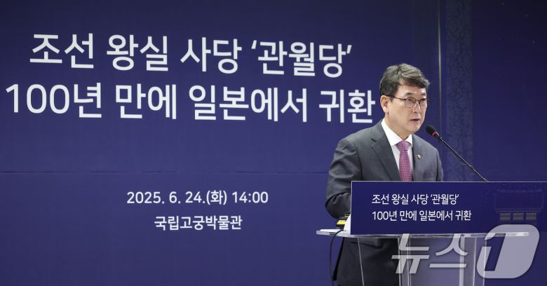 (서울=뉴스1) 김성진 기자 = 최응천 국가유산청장이 24일 서울 종로구 국립고궁박물관에서 조선 왕실 사당 '관월당' 귀환 언론공개회에서 인사말을 하고 있다. 조선시대 왕실 사당 건축물로 추정되는 '관월당'은 일본으로 반출된지 약 100년 만에 국내로 돌아왔다. 현재 '관월당'으로 불리는 이 건물은 정면 3칸, 측면 2칸 규모의 조선 후기 왕실 사당 양식을 지닌 목조 건축물이다. 2025.6.24/뉴스1