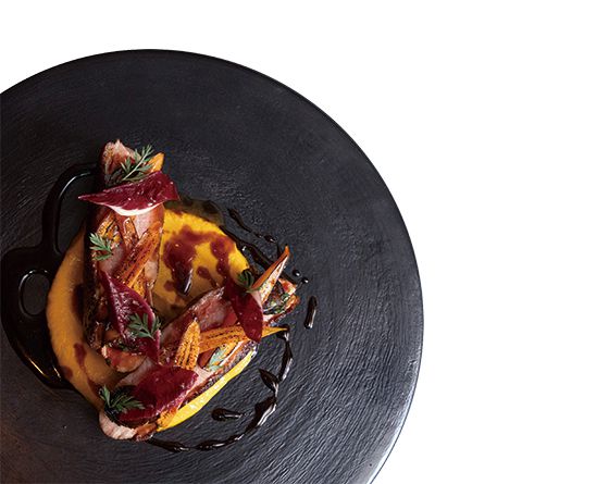 메인 메뉴 중 하나로 제공되는 오리 가슴살 구이는 경북 봉화 오리를 볏짚에 훈연해 촉촉하게 구워낸 뒤 제주도 구좌읍 흙당근을 훈연 버터와 같이 넣어 수비드 조리해 만든 당근 퓨레와 함께 낸다. 참기름과 액젓으로 만든 드레싱에 버무린 튀김 미니 양배추, 오리 부속물로 만든 바비큐 소스도 곁들였다. 다른 메뉴에서는 훈연향이 은은하게 났다면 오리 가슴살 구이는 화려한 숯향이 풍부하게 입맛을 돋운다. 곁들인 채소에도 불향이 나는 만큼 처음부터 끝까지 향기롭게 마무리 된다.