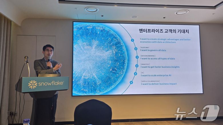(서울=뉴스1) 김민석 기자 = 스노우플레이크(Snowflake)는 24일 서울 역삼동 AC 호텔 서울 강남에서 '스노우플레이크 서밋 2025 기자간담회'를 열고 자연어 기반 AI 에이전트 '스노우플레이크 인텔리전스'를 비롯해 데이터 엔지니어링·AI 컴퓨팅 등 신기술을 소개했다.