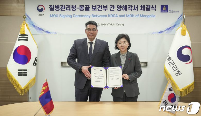 지난해 2월 15일 지영미 질병관리청장과 엥흐볼드 세레자브 몽골 보건부 차관이 충북 오송에서 미래 감염병 위협 대응을 위한 양국의 포괄적 협력 양해각서를 체결하고 있다. (질병관리청 제공) /뉴스1 |