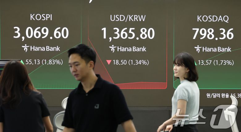 24일 오전 서울 중구 하나은행 딜링룸 전광판에 코스피, 코스닥 지수와 원달러 환율이 표시되고 있다. 2025.6.24/뉴스1 ⓒ News1 장수영 기자 |