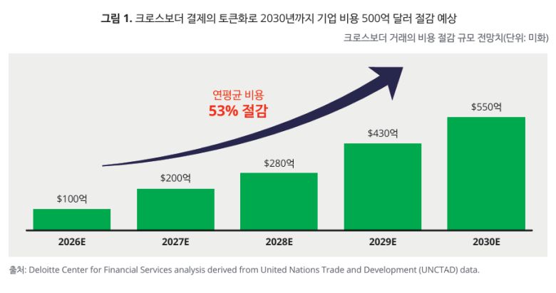 크로스보더 결제 분야에서는 다중 은행 토큰화 네트워크가 기존 국제 결제 인프라의 한계를 뛰어넘는 대안으로 부상하고 있다. 특히 도널드 트럼프 미국 대통령이 2025년 1월 재취임 직후 "합법적이고 정당한 달러 기반 스테이블코인의 성장"을 촉진하겠다는 행정명령을 내리면서 제도적 기반이 마련되고 있다.딜로이트는 2030년까지 고액 국제 송금 4건 중 1건이 다중 은행 토큰화 플랫폼에서 정산될 것으로 전망하며, 이를 통해 기업들의 크로스보더 거래 비용이 약 12.5% 절감되어 총 500억 달러 이상의 비용 절감 효과가 있을 것으로 예측했다.