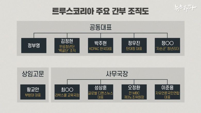 트루스코리아 간부진에는 10여 개 협력단체와 70여 명이 넘는 보수 지향 단체 인물들이 한 자리씩 이름을 올렸다. 이들 중 다수가 과거 이명박 박근혜 정권에서 국정원과 댓글공작을 벌였거나, 윤석열 정권에서 언론장악 홍위병으로 나섰거나, 부정선거 음모론을 퍼뜨리고 윤석열의 내란을 옹호한 자들이다.