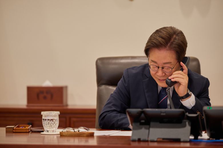 이재명 대통령이 지난 23일 용산 대통령실에서 안와르 이브라힘 말레이시아 총리와 통화하고 있다. 대통령실 제공 |
