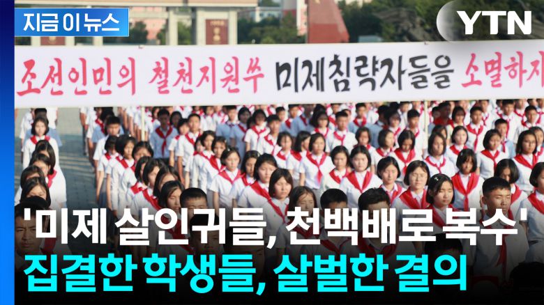 학생들 뒤로는 `미제 살인귀들을 천백배로 복수하자`, `미제 침략자들을 소멸하자` 등의 정치구호가 등장했습니다.