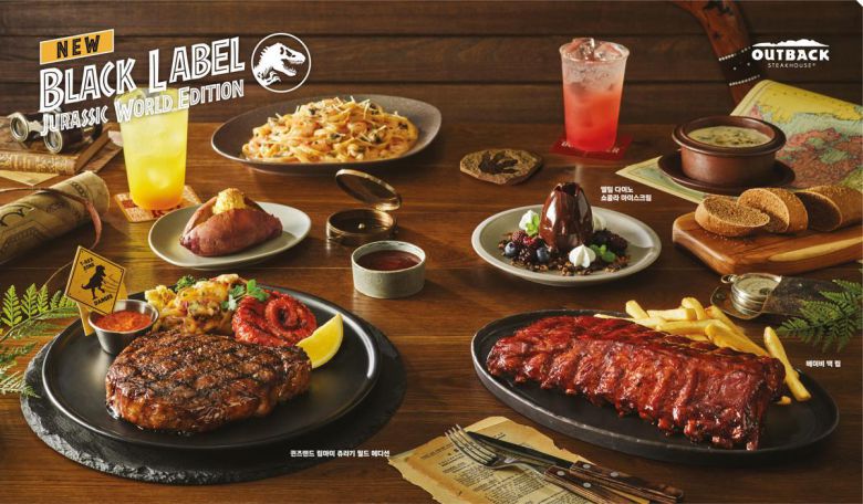 외식업계도 다양한 컬래버레이션을 시도하고 있다. 다이닝브랜즈그룹은 16일 자사 패밀리 레스토랑 브랜드인 ‘아웃백’과 영화 ‘쥬라기월드’ 시리즈와 협업한 컬래버레이션 메뉴를 선보였다. 공룡을 연상시키는 ‘블랙라벨 스테이크 쥬라기월드 에디션’에 더해 공룡알을 형상화한 초콜릿 디저트 ‘멜팅 다이노 쇼콜라 아이스크림’ 등 공룡을 연상시키는 메뉴들이 특징이다.