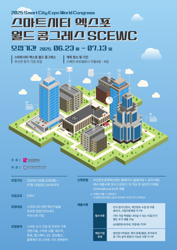 [부산=뉴스핌] 박성진 기자 = 부산창조경제혁신센터는 11월 스페인 바르셀로나에서 열리는 '2025 스마트시티 엑스포 월드콩그레스(SCEWC)'에 참가할 지역 창업기업을 다음달 13일까지 모집한다고 24일 밝혔다.