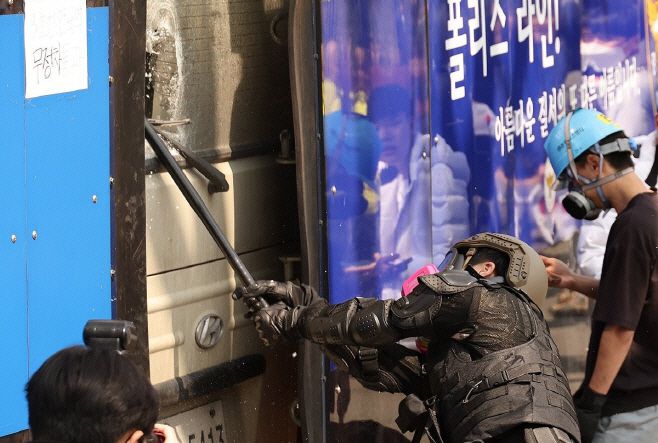 지난4일 서울 종로구 헌법재판소 인근에서 윤석열 대통령 지지 집회 참가자 중 한 명이 헌재의 윤 대통령 파면 결정에 경찰이 세운 가벽 사이로 보이는 차량을 부수고 있다./연합뉴스 |