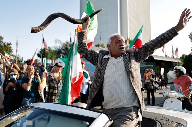 미국 로스앤젤레스(LA)에서 23일(현지시간) 이란 정권 교체 지지자들이 시위하고 있다. 로스앤젤레스/AFP연합뉴스