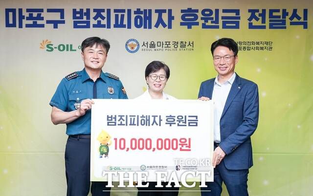 [더팩트ㅣ장혜승 기자] 에쓰오일은 24일 서울 마포구 본사에서 마포구 범죄피해자 후원금 전달식을 갖고 사랑의전화 마포종합사회복지관에 후원금 1000만원을 전달했다고 밝혔다.