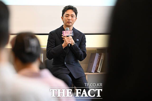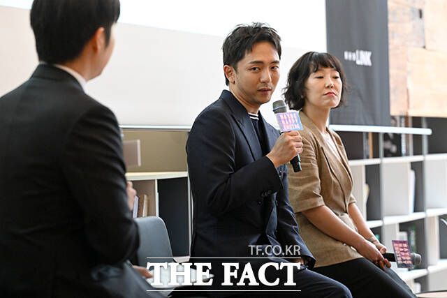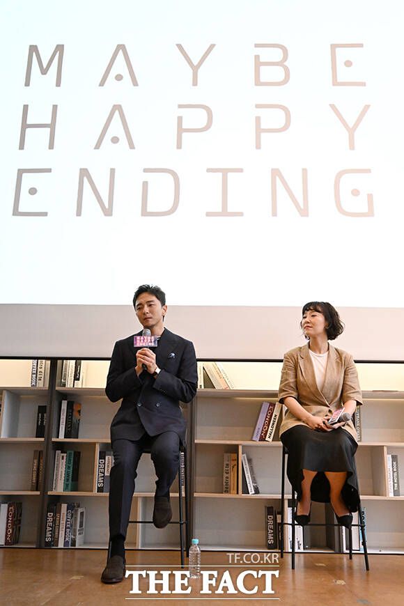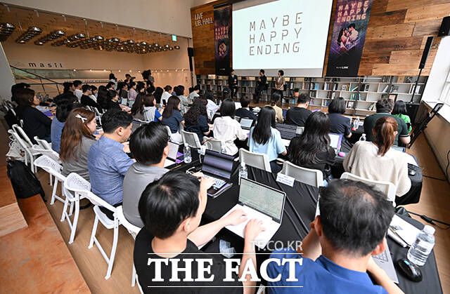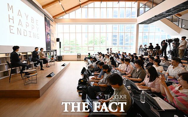 [더팩트ㅣ서예원 기자] 박천휴 작가(가운데)가 24일 오후 서울 중구 커뮤니티하우스 마실에서 열린 뮤지컬 '어쩌면 해피엔딩' 제78회 토니상 6관왕 기념 기자 간담회에 참석해 취재진의 질문에 답변하고 있다.