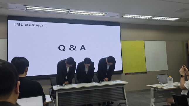 24일 서울 중구 삼화타워에서 열린 SK텔레콤 유심 해킹사태 브리핑에서 김희섭 PR센터장(왼쪽부터), 임봉호 MNO사업부장, 류정환 네트워크인프라센터장이 고개를 숙이고 있다. / |