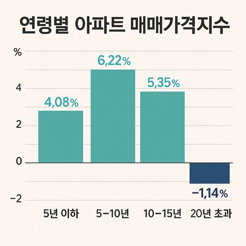 반면 20년 초과된 구축 아파트는 1.14% 하락하며 상반된 흐름을 보였다. 수도권 역시 5년 이하 신축 아파트의 변동률은 7.64%로 모든 연령대 중 가장 높았다. 이어 5~10년은 6.22%, 10~15년은 5.35%를 기록했다.