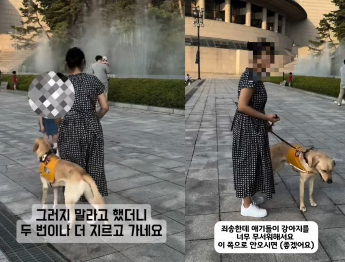 A씨는 "다른 엄마들은 '쟤는 안내견이고 사람 도와주는 착한 개야'라고 설명해주더라"며 "한 마디 더 하려고 했는데 남편이 대화도 통하는 사람한테 하는 거라며 나를 끌어서 참았다"고 했다.