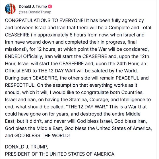 도널드 트럼프 미국 대통령이 23일(현지시간) 이스라엘과 이란이 전면적인 휴전에 합의했다며 자신의 소셜미디어 트루스소셜에 올린 글. 이란의 12시간 동안 휴전에 이어 이스라엘의 12시간 동안 휴전과 함께 24시간 뒤 세계는 ‘12일 전쟁’의 공식적인 종식을 축하할 것이라는 내용이 들어 있다. 사진 트루스소셜 캡처 |