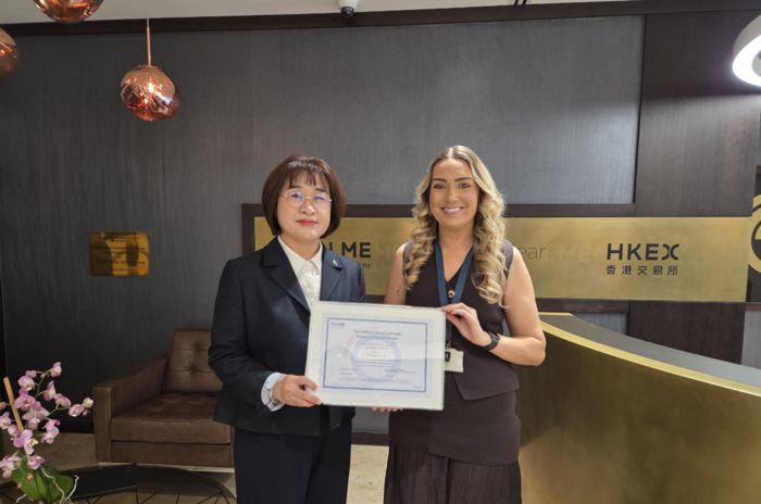 홍수남 DS단석 상무(왼쪽)와 애비 웨스트 런던금속거래소 브랜드부문장과 기념촬영을 하고 있다. [사진 제공=DS단석] |