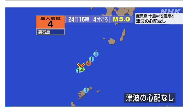 지진은 전날 오후 4시 4분경 토시마무라에서 관측됐다. 진원지는 토카라 열도 근해로, 지진의 규모를 나타내는 매그니튜드는 5.0으로 추정된다.