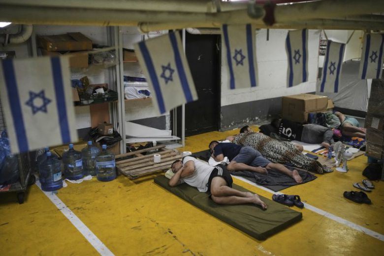 24일(현지시간) 이스라엘 텔아비브의 지하 주차장에서 이란의 미사일 공격을 피해 도망친 난민들이 잠을 청하고 있다.AP뉴시스