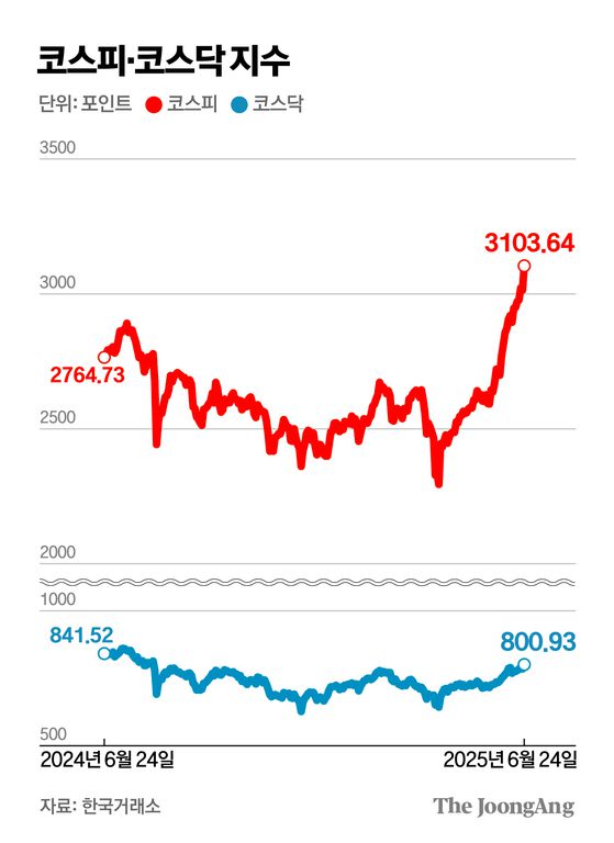 코스피가 3100선을 넘어섰다. 한국거래소에 따르면 24일 코스피는 전일 대비 2.96% 오른 3103.64로 장을 마감했다. 종가 기준으로 코스피가 3100을 넘어선건 2021년 9월 27일(3133.64) 이후 약 3년 9개월 만이다. 코스닥 지수 역시 800.93으로 전 거래일 대비 2.06% 상승해 지난해 8월1일(813.53) 이후 약 11개월 만에 800선을 넘어 장을 마쳤다.