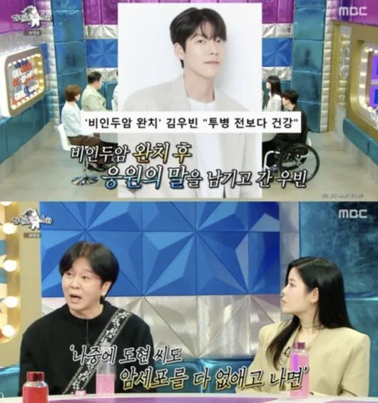 김우빈은 ‘유퀴즈’에 출연해 암투병 중인 이들에 응원의 메시지를 전하며 “지금 병마와 싸우고 계신 분들 얼마나 아프고 고통스러우실지 두렵고 무서우실지 다는 모르지만 저도 겪어봤기 때문에 어느 정도는 알 것 같다. 잘못해서 이런 일이 우리에게 펼쳐진게 아니라 우리는 그 중에서 운이 안 좋았던 것뿐이니까 후회나 자책하시면서 시간 보내지 마시고 여러분 자신과 여러분이 사랑하는 많은 분 생각하시면서 힘내주셨으면 좋겠다. 저도 많이 응원받고 기도받았던 마음 잘 간직해서 오늘도 더 많은 가정에 기적이 일어날 수 있도록 간절히 기도하겠다”라고 말했다.