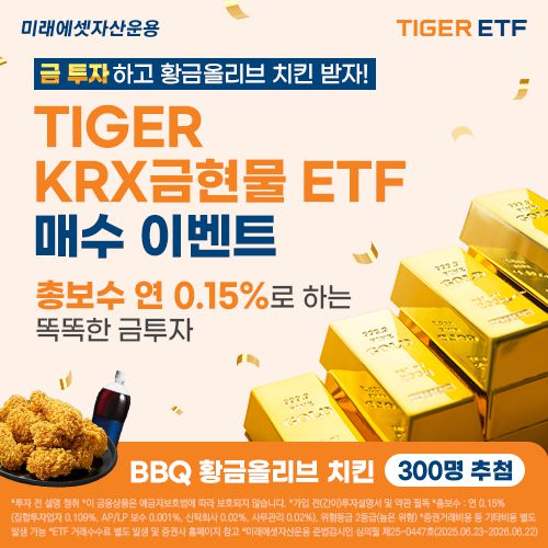 한편, 미래에셋자산운용은 ‘TIGER KRX금현물 ETF’ 신규 출시를 기념해 거래 고객을 대상으로 상장 기념 이벤트를 진행한다. SK증권에서 해당 ETF의 일 거래 조건을 충족한 일부 고객에게 문화상품권이 증정된다. 또한 ‘TIGER KRX금현물 ETF’를 매수하고 인증한 고객 가운데 추첨을 통해 경품을 제공한다. 자세한 이벤트 내용은 해당 증권사 및 TIGER ETF 홈페이지에서 확인 가능하다.