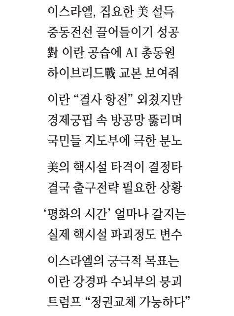 6월 21일(미국 동부시간 기준) 미국이 이란 포르도, 나탄즈, 이스파한의 핵시설을 전격 공습했다. 도널드 트럼프 미국 대통령은 이번 공격이 이란의 핵 위협을 제거하고 전 세계의 안전을 확보할 필수 조치였다고 강조했다. 특히 미국만이 파괴할 수 있는 지하 80m 요새인 포르도 핵시설을 초대형 벙커버스터와 B-2 스텔스 폭격기로 완전히 제거했다고 주장했다. 미국 우선주의를 앞세우며 중동의 무력 충돌에 개입하지 않겠다던 트럼프 대통령을 움직인 건 바로 이스라엘의 이란 핵 선제공격이었다. 이스라엘은 이란의 방공·정보·지휘체계를 무력화하며 압도적 우위를 확보한 뒤 미국을 집요하게 설득해 마침내 이스라엘·이란 전선으로 끌어들이는 데 성공했다. 공격 다음날 이란을 상대로 '정권 교체' 가능성까지 시사하며 최대 압박을 가한 트럼프는 23일 이스라엘과 이란 간 휴전 합의를 전하며 다시 세계를 놀라게 했다. 이란은 트럼프가 말한 휴전 합의가 최종 결정은 아니라고 말하고 있지만 이스라엘과 이란의 충돌 완화 흐름은 중동 정세에 분수령을 예고하고 있다. 트럼프는 휴전이 얼마나 지속될지에 대해 "무기한(unlimited)이라고 생각한다"며 기대하고 있다.
