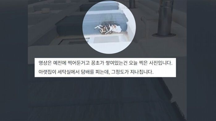 글쓴이는 아랫집 주민이 꽁초는 난간에 모아두고 담배를 마구 피워, 자기 집 세탁실은 담배 연기로 자욱하고 옷에까지 냄새가 배는 수준이라고 말했습니다.