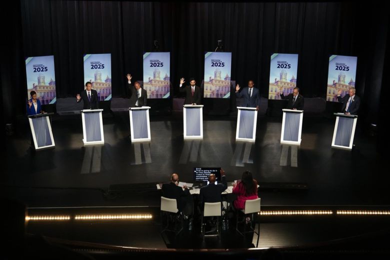 12일(현지 시간) 미국 민주당 뉴욕시장 예비선거(경선)에 출마한 후보자들이 토론회에서 발언하고 있다. 24일 실시된 예비선거는 사실상 앤드루 쿠오모 전 뉴욕주지사(왼쪽 두번째)와 조란 맘다니 뉴욕주 하원의원(왼쪽 네번째)의 2파전이 될 것이란 관측이 나온다. 뉴욕=AP 뉴시스