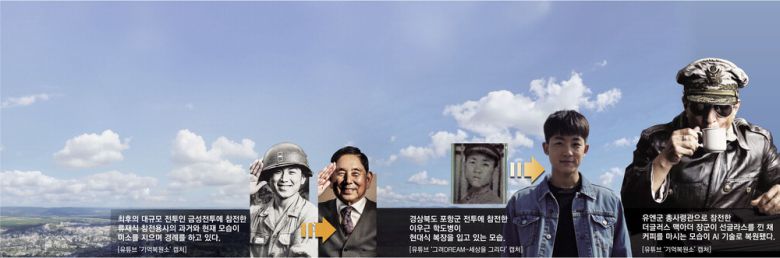군복을 입은 청년과 머리가 희끗한 노인이 같은 곳을 바라본다. 두 사람은 고개를 돌려 서로를 바라보더니 이내 부둥켜안는다. 다른 장면에서는 군복 차림의 청년과 양복을 입은 중년 남성이 팔짱을 낀 채 같은 방향을 응시하다 이내 서로를 향해 미소 짓고 경례한다. 이들은 모두 6·25전쟁에 참전했던 인물들의 과거와 현재 모습이다. 흑백 증명사진 속에 멈춰 있던 얼굴들이 70여 년의 세월을 지나 화면 속에서 생생히 되살아난 것이다.