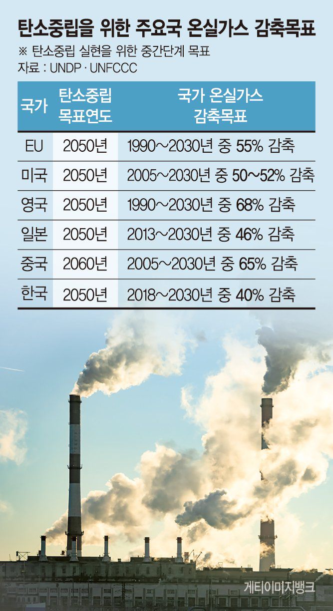 우리나라는 탄소중립을 위한 중간 목표로 2030년까지 온실가스를 2018년 대비 40% 감축하는 계획을 추진하고 있으며 이를 위해 재생에너지 확대, 산업구조 전환, 탄소포집 기술 개발 등을 추진하고 있다.
