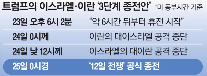 트럼프 대통령은 미 공군이 이란의 핵시설을 공격한 지 이틀 만인 전날 저녁에도 이스라엘과 이란이 ‘완전하고 전면적인’ 휴전에 합의했다고 발표했다. 그러면서 휴전이 양국의 최종 작전 수행(트럼프 대통령의 합의 발표 시점으로부터 약 6시간 이내)→이란의 12시간 휴전(대이스라엘 공격행위 중단)→이스라엘의 12시간 휴전(대이란 공격행위 중단) 3단계로 구성된다고 밝혔다.