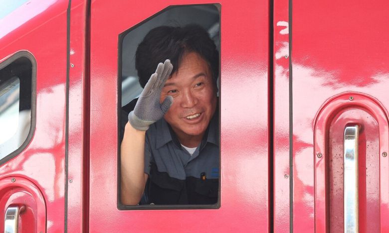김영훈 고용노동부 장관 후보자가 23일 경북 김천역에서 ITX-마음 열차를 운행하기 위해 열차에 탑승해 배웅 나온 역무원에게 인사하고 있다. 연합뉴스
