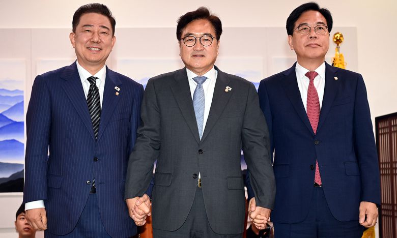 우원식 국회의장과 여야 원내대표들이 24일 국회에서 추가경정예산안 처리를 위한 본회의 개최 일정과 상임위원장 재배분 문제 등을 논의하기 위해 회동하고 있다. 왼쪽부터 더불어민주당 김병기 당 대표 직무대행 겸 원내대표, 우원식 국회의장, 국민의힘 송언석 원내대표. 연합뉴스