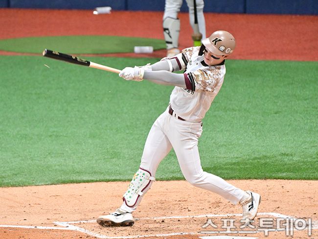 [스포츠투데이 팽현준 기자] 24일 서울 고척스카이돔에서 열린 2025 KBO리그 KIA 타이거즈와 키움 히어로즈의 경기, 3회말 무사 1,2루 키움 전태현이 1타점 적시타를 때리고 있다. 2025.06.24.